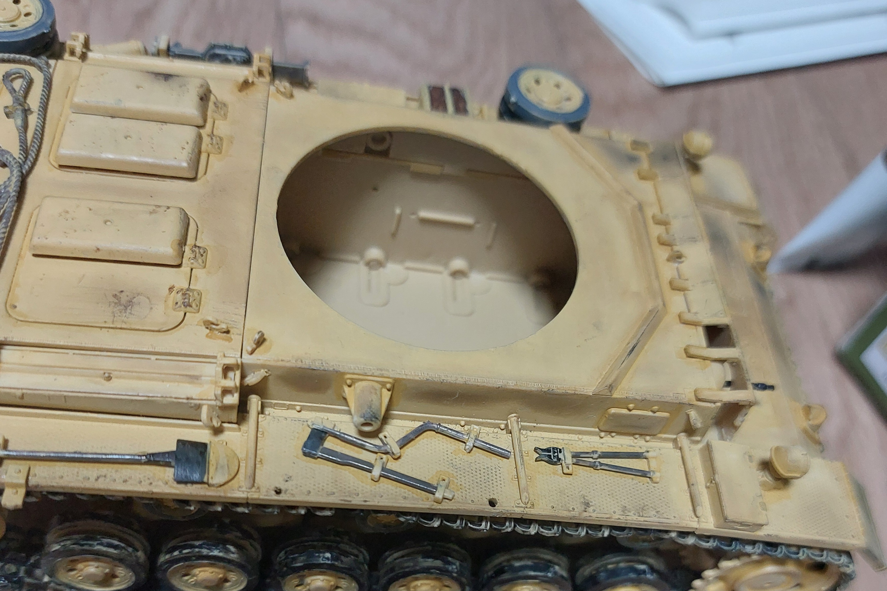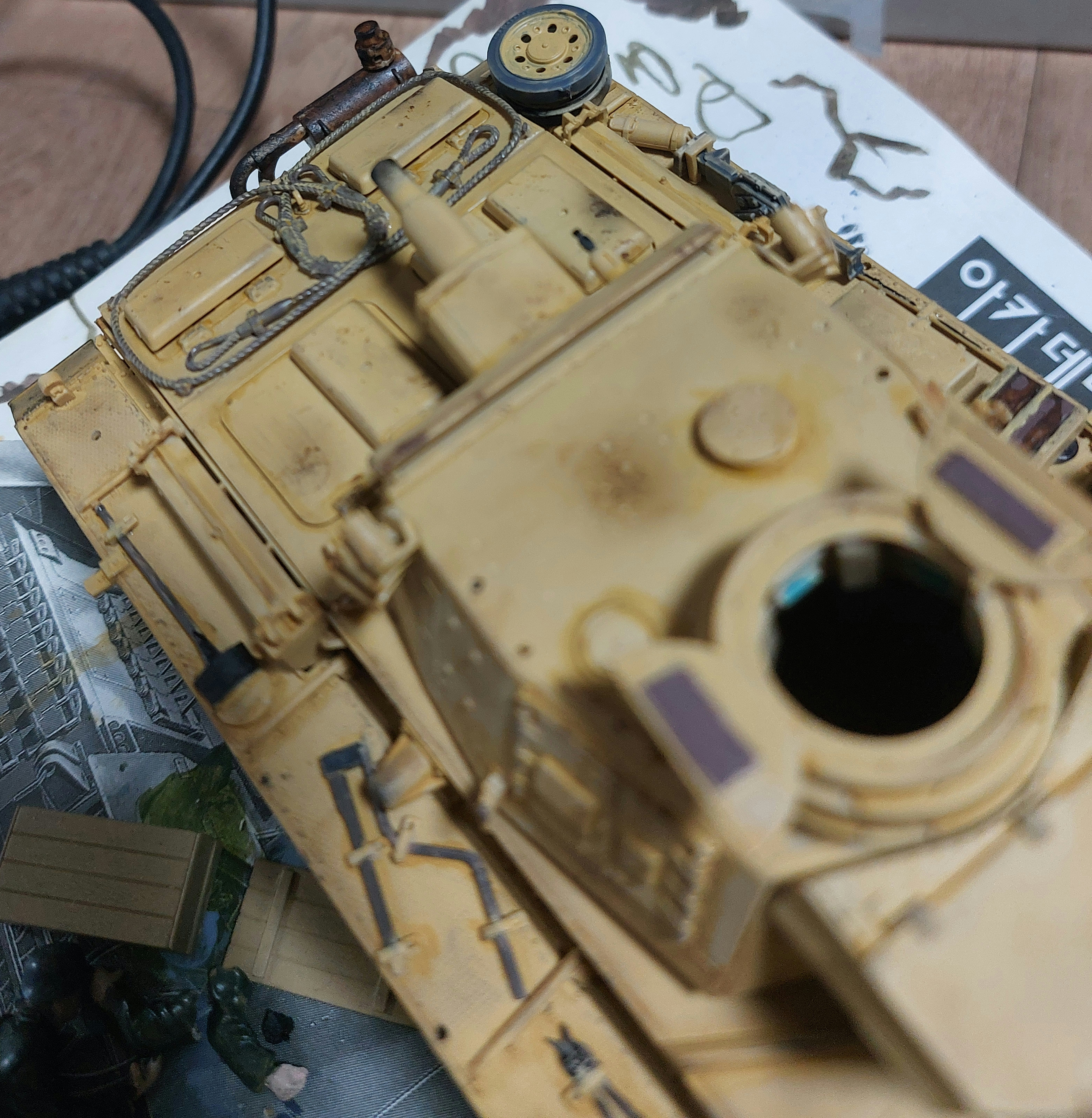 포탑도 조립하면서 도색하고 웨더링 입혔는디 차체랑 안맞는듯 하다. 승무원이 타고 내린 위치만 집중적으로 웨더링을 줬는데 너무 심하게 준거 깉다.